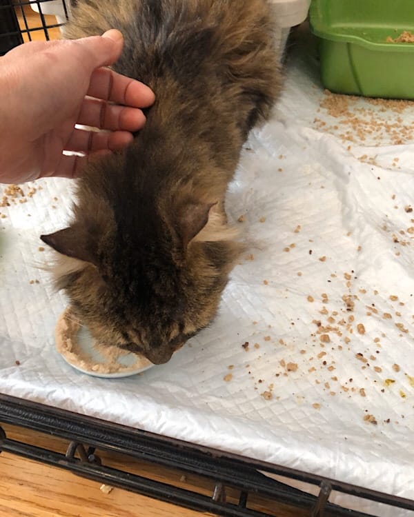 This morning, in pure desperation, I puree’d a can of tuna with a stick blender et voila! Kitty crack. The doors of Thunderdome have been flung open…