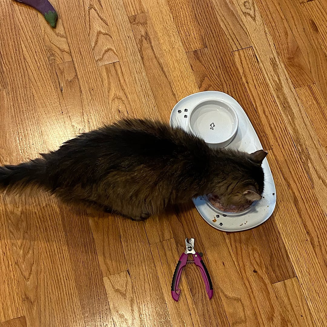 Fang’s claws are getting out of control, the last (and only) time they’ve ever been clipped is when they knocked him out to remove his teeth 4 months ago. I’ve let it go as long as I could but he’s starting to get stuck on his scratching post so it’s time…. I’ve tried a couple of times already but no go so I brought out the ol’ tuna fish…