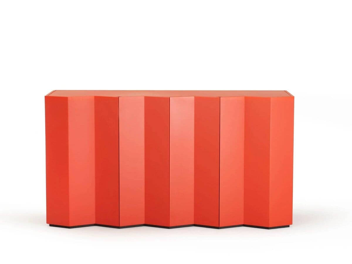 The Geometric Sideboard by Zanotta features a frame made of MDF and blockboard wood, matt lacquered in various colors. It includes adjustable internal shelves in tempered glass and offers an option for integrated LED lighting.