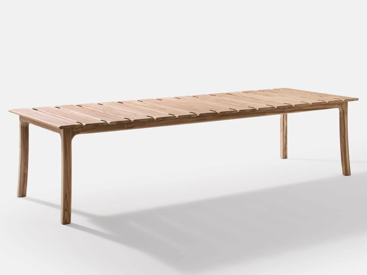 The Teak Garden Table by RODA is crafted from solid teak with clean lines and a robust silhouette. Ideal for outdoor gatherings.