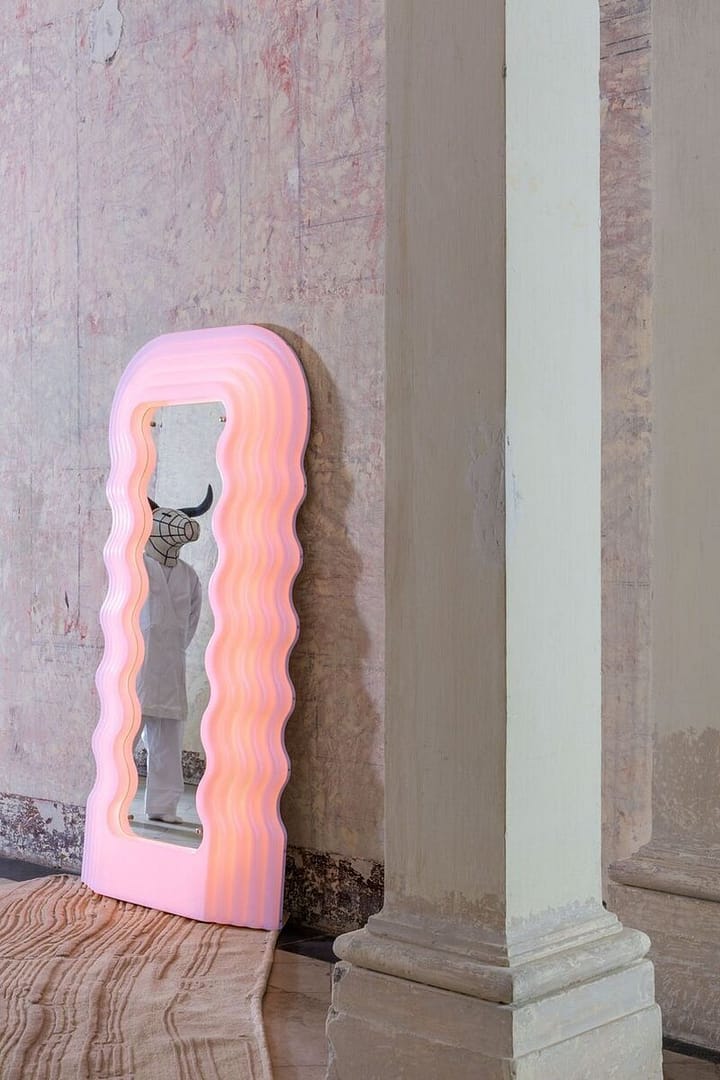 The Ultrafragola Mirror by Poltronova, designed by Ettore Sottsass in 1970, features a sinuous profile suggesting long wavy hair. Made of vacuum-formed opaline PETG with LED lighting.