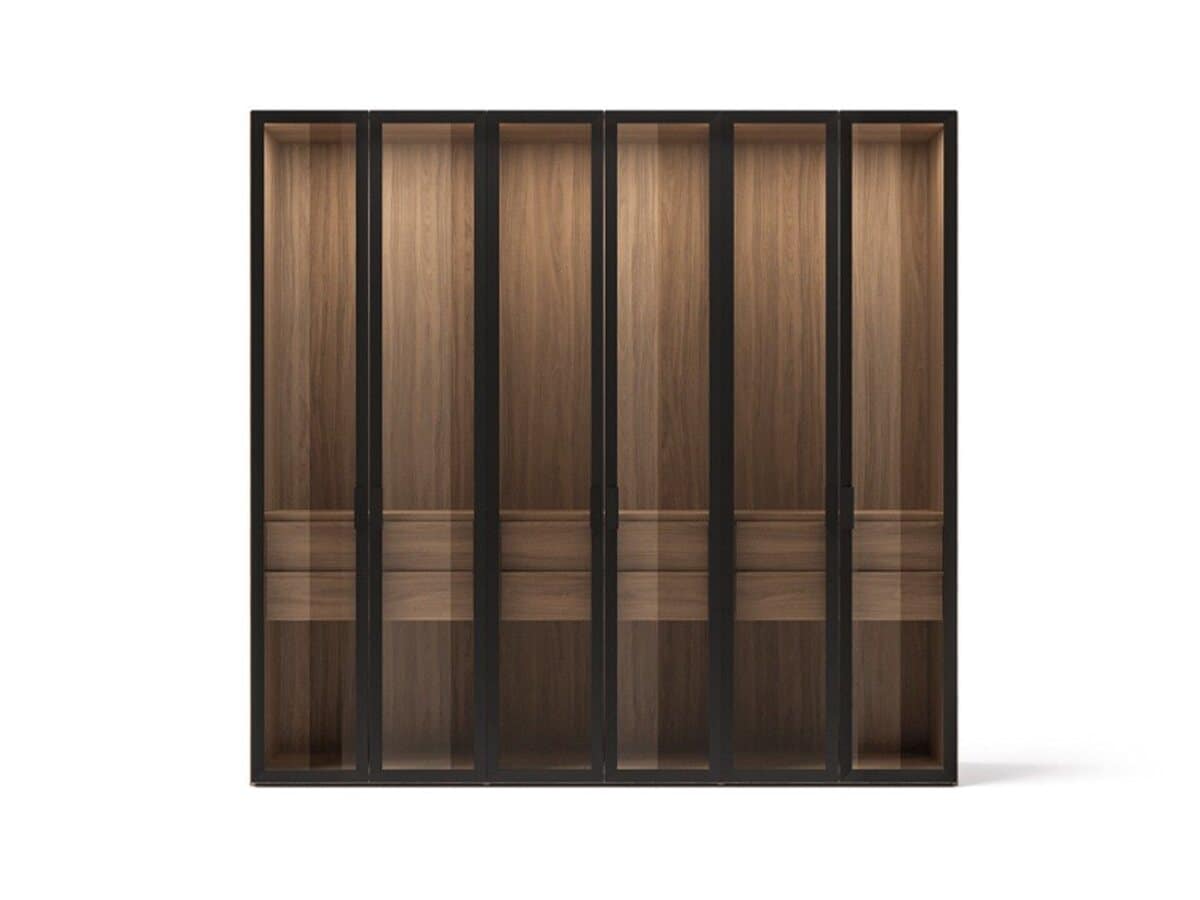 The Wood & Glass Wardrobe by Kico blends natural and transparent materials, offering interior organization and external aesthetic versatility.